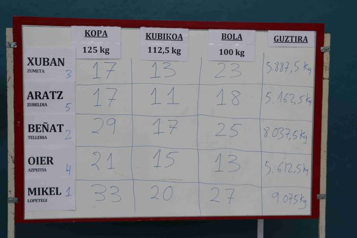 Gizonezkoetan, Urrak alde nabarmenarekin irabazi zien lau aurkariei: hiru minutuko txandetan, 125 kiloko kopa 33 bider altxatu zuen, 112,5 kiloko kubikoa 20 aldiz, eta 100 kiloko bola, 27 aldiz. Guztira 9.075 kilo altxatu zituen zarauztarrak. Konparaziorako, Beñat Telleriak egin zuen bigarren, eta horrek 8.037,5 kilo altxatu zituen, eta hirugarren izan zen Xuban Zumeta zarauztarrak, berriz, 5.887,5 kilo –behean sailkapen osoa–.