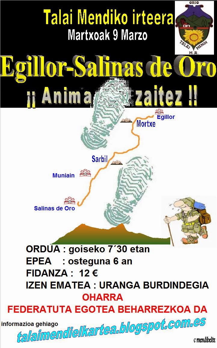Martxoaren 9an, 30 bat laguneko taldea elkartu ginen zeharkaldi eder hau egiteko asmoz. Zeharkaldia Egillor herrixkan hasten zen, Mortxe tontorrera igo, ondoren Sarbil tontorrera, hemendik Muniain herrixkara jaitsi eta azken txanpa lauean eginez Jaitz edo Salinas de Oro herrixkaraino. Gustora geratu ginen zeharkaldiarekin, eguraldi ezin hobeak, inguratzen gintuen paisaiaz gozatzen lagundu zigun. Eta ibilaldia amaitu ondoren Salinas de Oron egin genuen egonaldia ezin hobe izan zen. Giro ona nagusi eta janedana!!