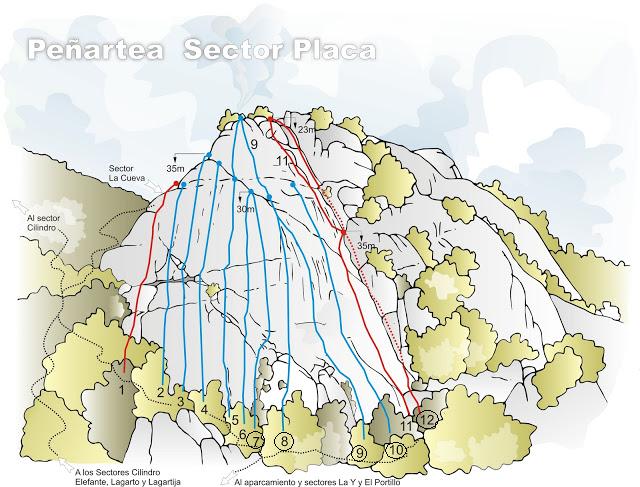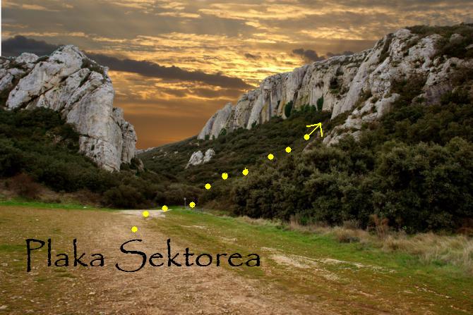 Zailtasun ertaineko bide ugari ditu eskola honek, gehienak 5. eta 6. mailakoak kimiko eta paraboltekin oso ongi hornituak. Gu, Plaka izenarekin esagutzen den sektorean jardun ginen. Borobiletan bilduta agertzen dira igo genituen bideak.