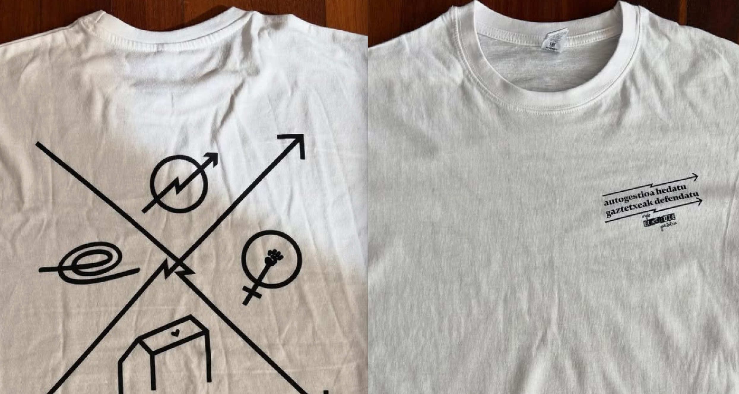 Autogestioa hedatu, gaztetxeak defendatu esaldia jarri dute elastikoen aurrealdean, eta atzealdean, Gaztetxearentzat garrantzitsuak diren hainbat ikur: autogestioarena, euskararena, feminismoarena eta Etxeluzerena berarena.