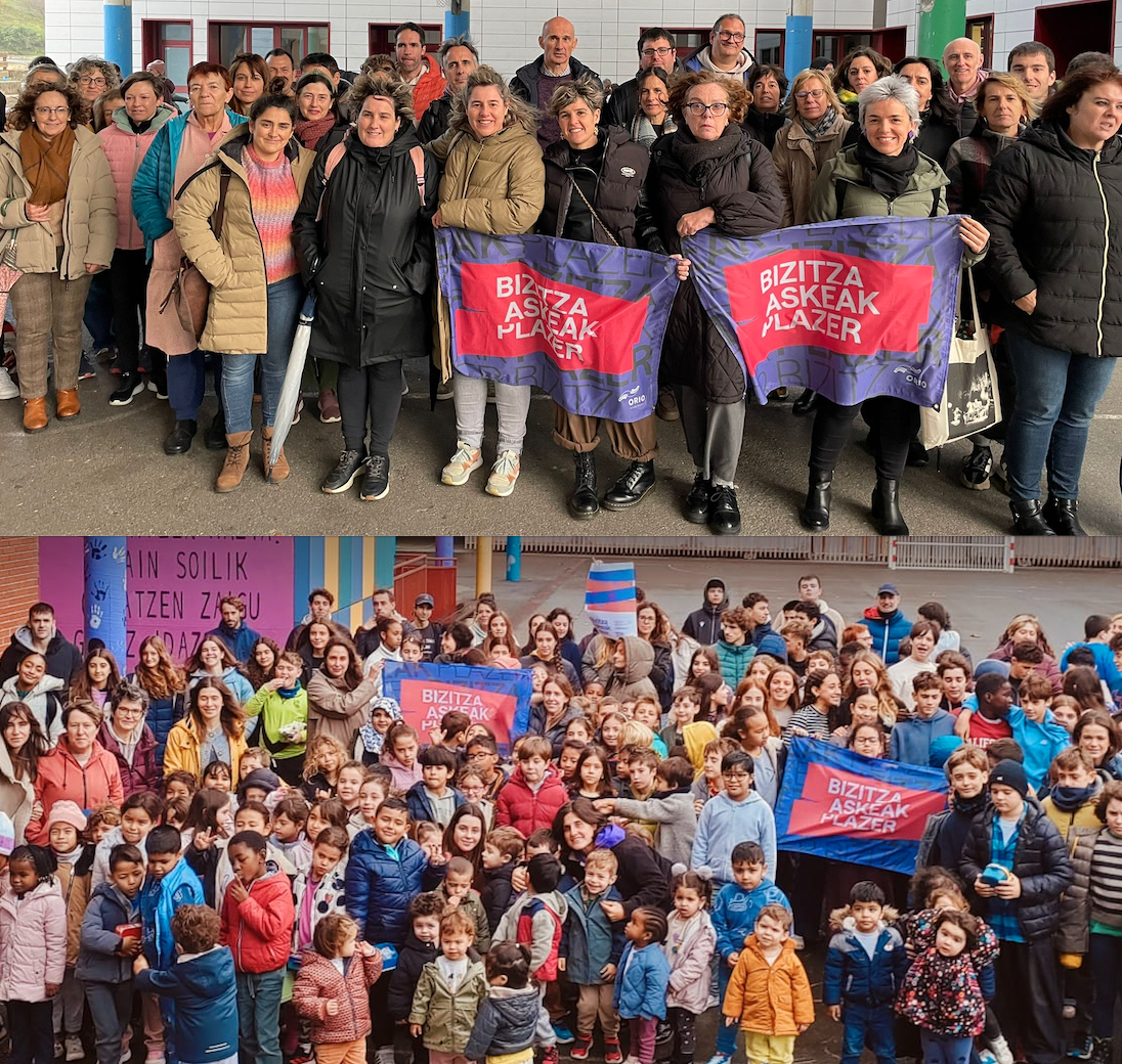 Indarkeria Matxistaren Aurkako Nazioarteko Eguna izan zen atzokoa, Azaroaren 25a, eta talde argazkiak atera zituzten bi eskoletan, batzuek eguerdian eta besteek arratsaldean, Bizitza askeak plazer lelo hartuta –udalak abiatu berri duen kanpainarekin abt eginez– baita eguna gaia hainbat eratara lantzeko aprobetxatu ere.